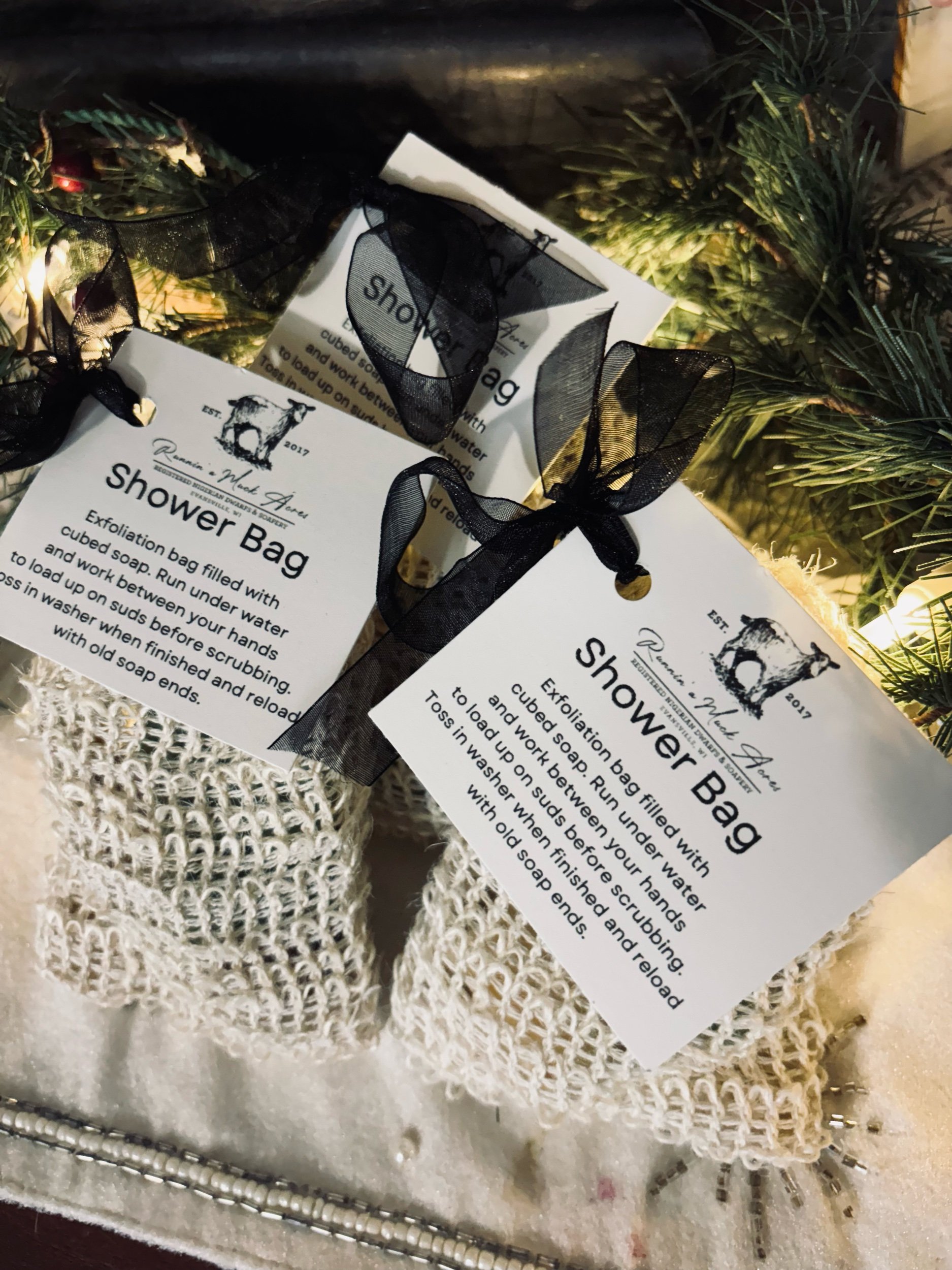 Exfoliation bag stuffed with cubed soap. Work bag in between hands to lather before use. Once soap runs out, toss in the washer and refill!
